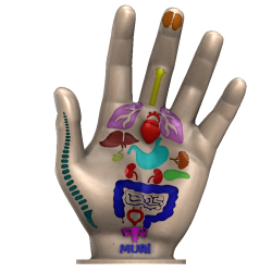 NA MÃO ESQUERDA TEMOS EM ALTO E BAIXO RELEVO, O CÉREBRO, TRAQUÉIA, PULMÃO, CORAÇÃO, FÍGADO, VESÍCULA, RIM, URÉTER, BEXIGA, ESTÔMAGO, PÂNCREAS, BAÇO, INTESTINO DELGADO E GROSSO, COLUNA E ÚTERO.